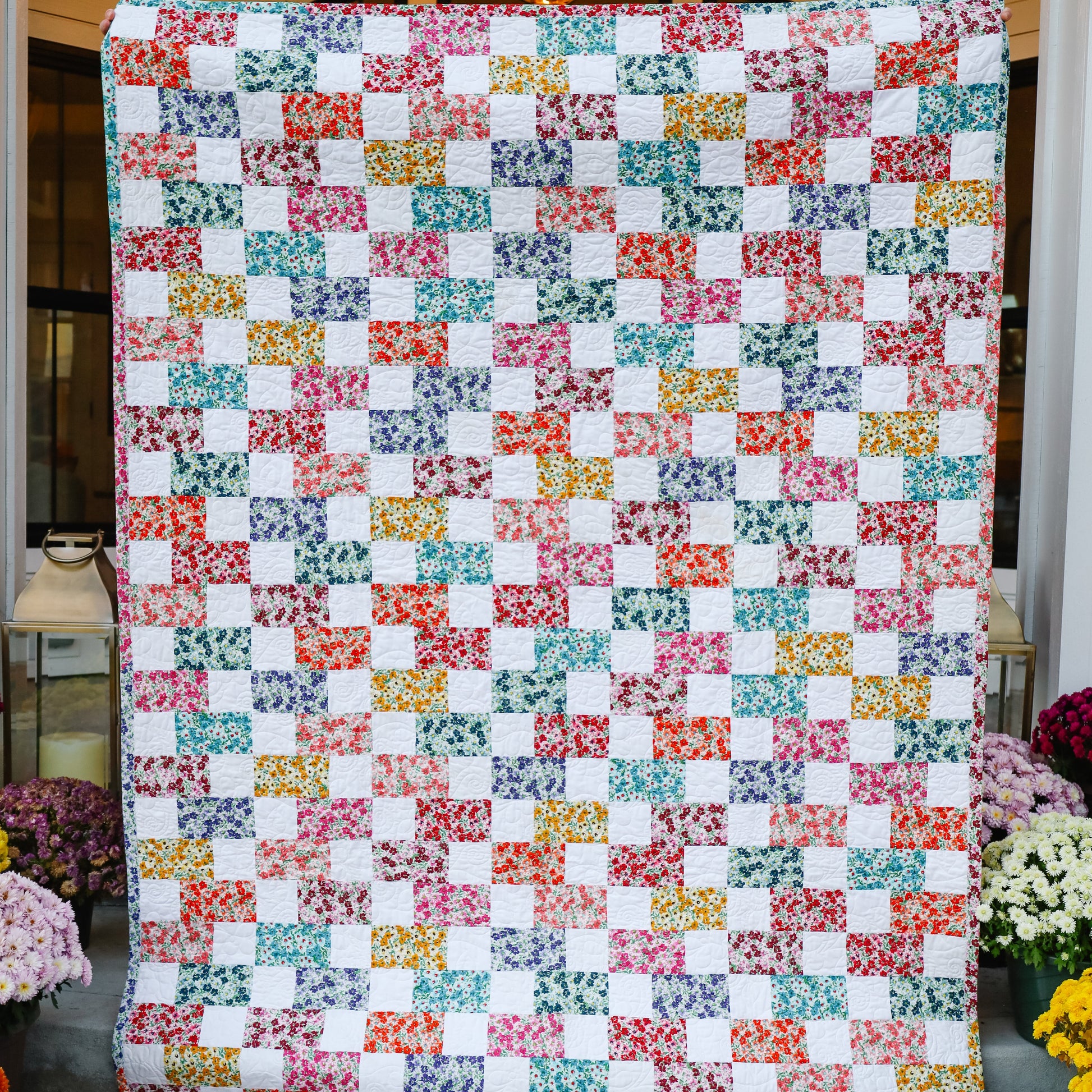 This beautiful quilt kit comes with all the fabric, binding, backing, and instructions for a finished 60" x 72" quilt. It features beautiful prairie florals in nine colorways.